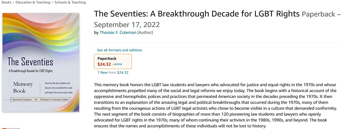 Memory Book. A book of LGBT legal history is now available. It contains historical background information of gay and lesbian rights in the 1950s and 1960s, biographies of more than 80 law students who were involved in gay and lesbian rights in the 1970s, and biographies of 40 lawyers who graduated in prior years and were actively involved in gay and lesbian rights advocacy in the 1970s. The book has received excellent reviews. A paperback version of the book is available for purchase through Amazon. A pdf version can be obtained by making a donation of $15 to Sectrum Institute. Those who attend the October 11 webinar will receive a complimentary copy of the pdf version.