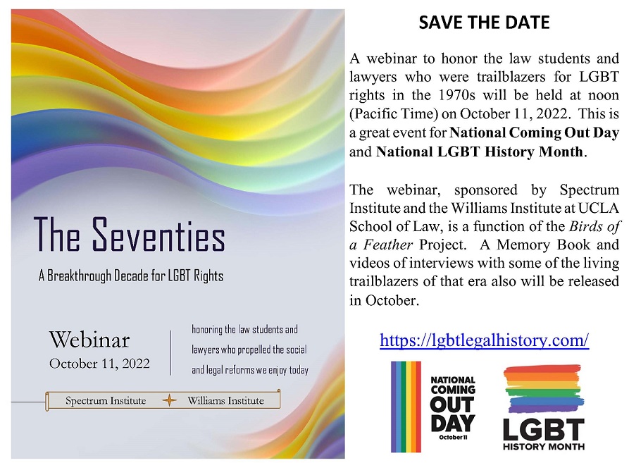 October 11 Webinars. The first presentation was held at noon (Pacific Time) on October 11, 2022. It is produced by Spectrum Institute and hosted by the Williams Institute of UCLA Law School. A history professor discussed the emergence of gay law student organizations in the 1970s. Several trailblazers from that era made video presentations and were present for the Q&A session. A law student made a presentation on how and when “out” transgender, nonbinary, and law students of color eventually emerged as advocates for LGBT rights. The webinar was mentioned in the September issue of LGBT Law Notes. A second presentation was held in person and online at College of the Desert at 3:30 pm. To view the PowerPoint presentation, click here.